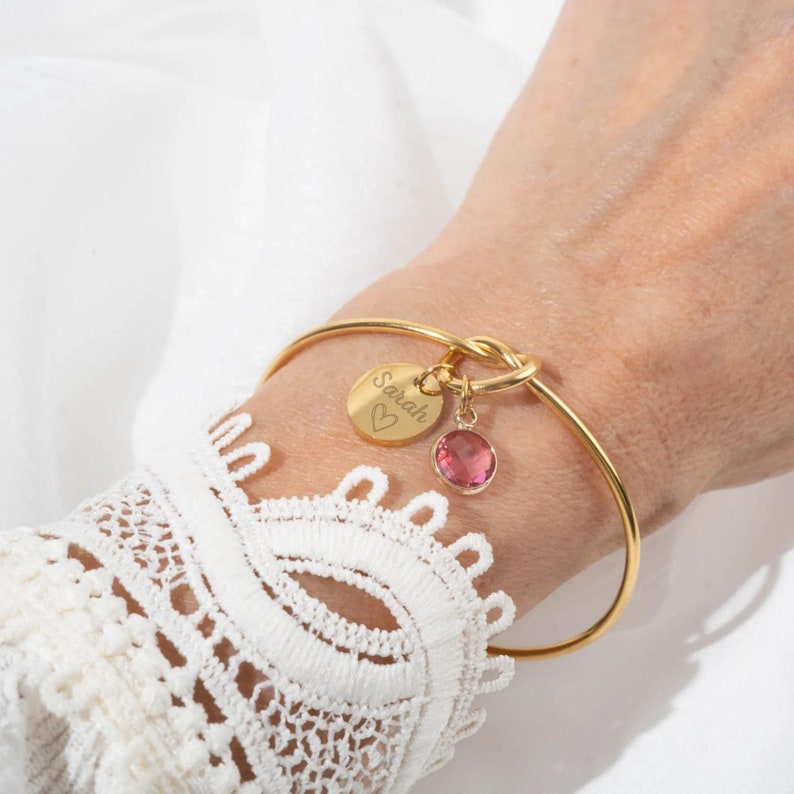 A meaningful keepsake designed to celebrate the bonds that matter most. This elegant knot bracelet features a sparkling 7mm birthstone and a disc charm that you can fully personalize. Whether it’s a name, date, symbol, birth flower, initial, or even a handwritten message, this bracelet lets you carry a piece of your story wherever you go.